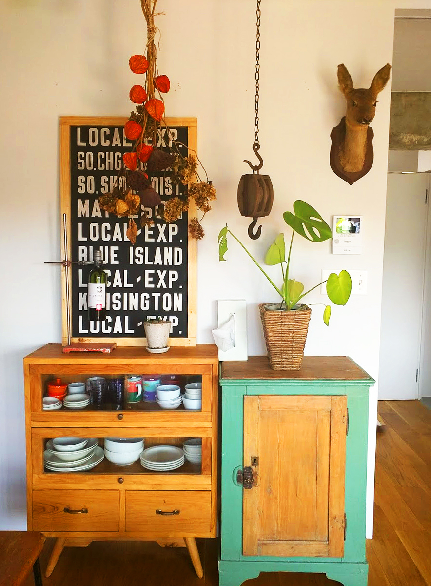 壁が白なので対比するようにアンティークや植物を固めました。家具は下にボリュームが出てしまうので、写真上のドライフラワーと鹿のハンティングトロフィーで上部の立体感を出してみました。